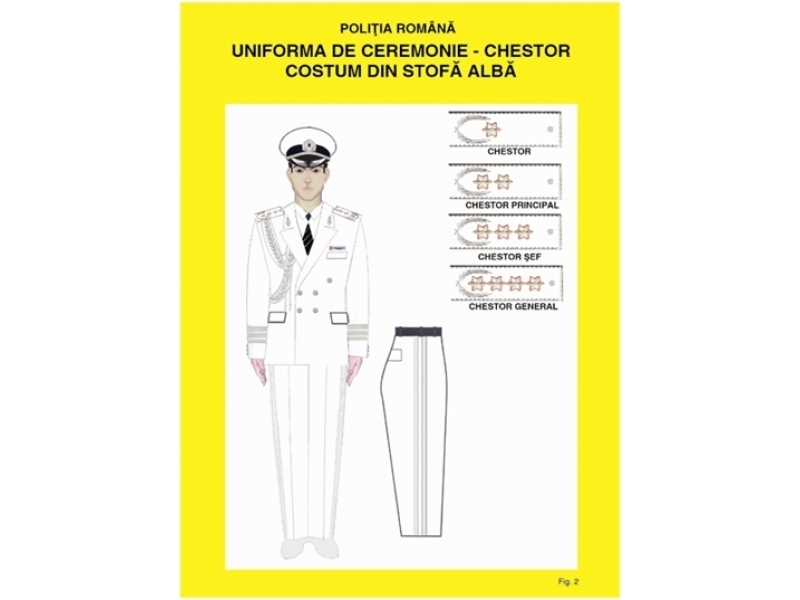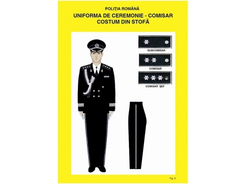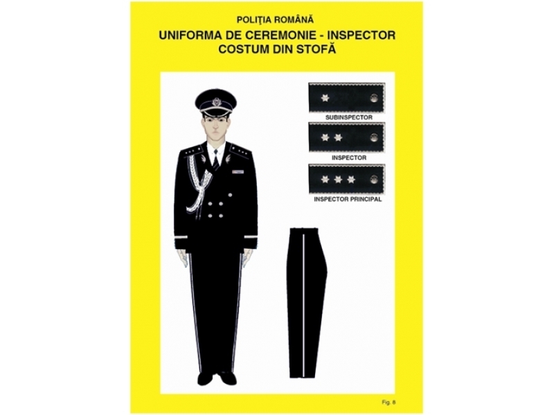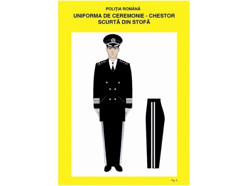 Este de culoare neagră sau albă. Se poartă de ofiţerii de poliţie cu funcţii de conducere, cu ocazia unor ceremonialuri, aniversări, spectacole etc şi se compune din: şapcă, sacou, pantalon şi pantofi.