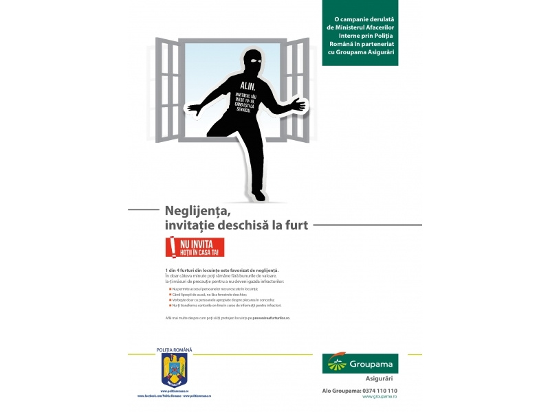 În perioada aprilie – august a.c., Inspectoratul de Poliţie Judeţean Caraş-Severin va desfăşura activităţi în cadrul campaniei naţionale de prevenire a furturilor din locuinţă: „Neglijenţa - invitaţie deschisă la furt”, derulată de Poliţia Română în parteneriat cu Groupama Asigurări S.A..