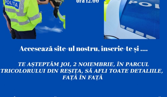 Jurnaliștii acreditați pe lângă Inspectoratul de Poliţie Judeţean Caraș-Severin sunt invitați să participe mâine, 2 noiembrie, începând cu ora 12:00, la un eveniment public de promovare a profesiei de polițist, în contextul concursurilor de admitere organizate de instituțiile de învățământ ale M.A.I.